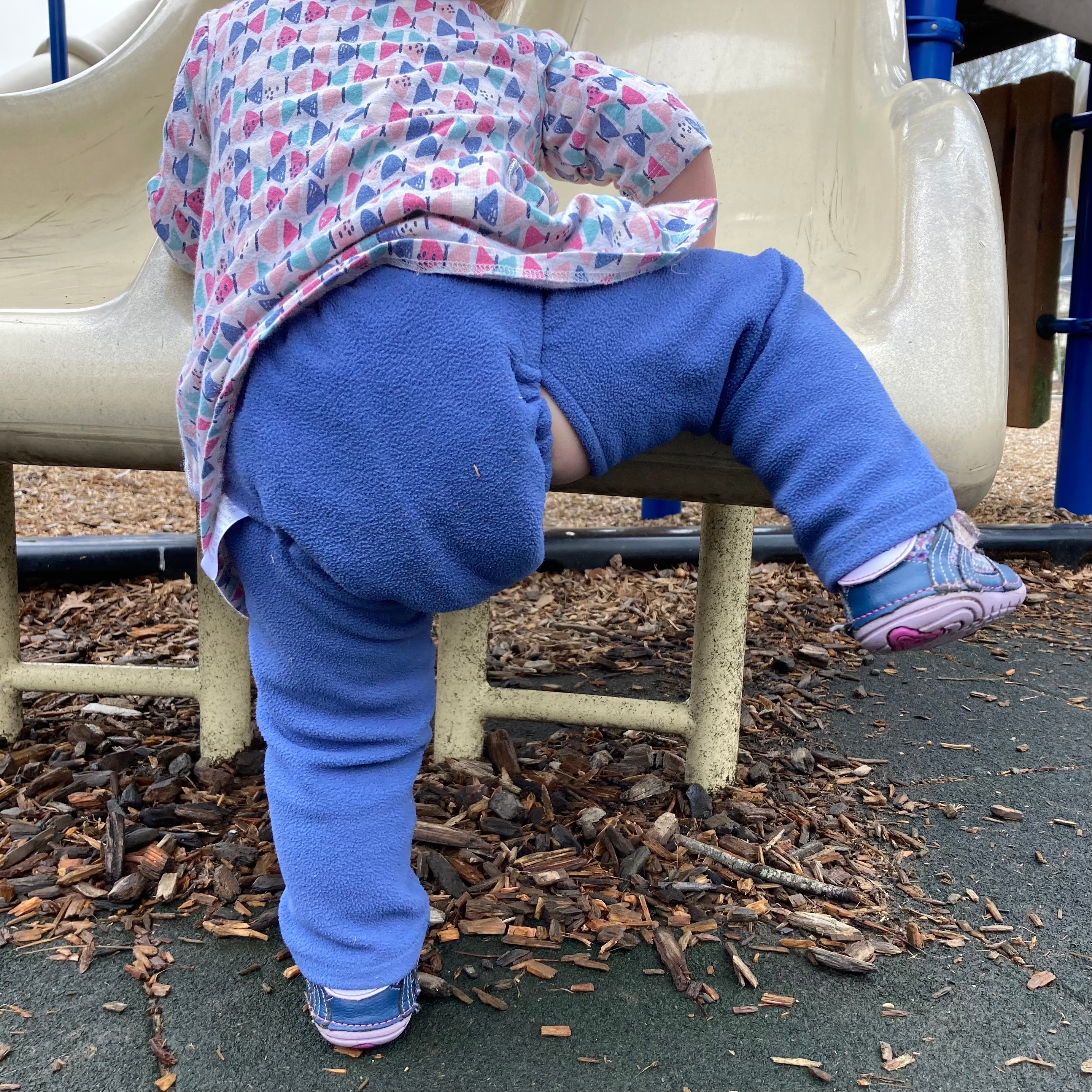 When the weather cools, snap the diaper to crotchless Chappy-Nappy pants instead of the belt for easy diaper changes and potty access year-round.